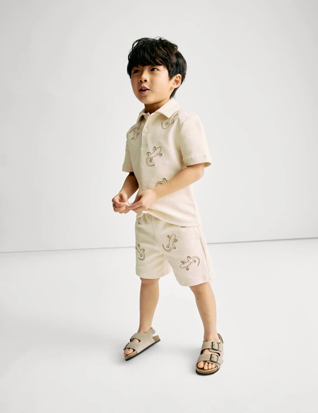This cotton-rich outfit is perfect for their next adventure. The short-sleeved shirt features a button-down collar and is embroidered with friendly geckos. The co-ordinating shorts have a comfy elasticated waist and a secure drawstring fastening.