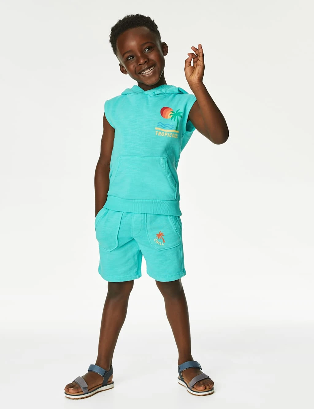 Kids will be ready for warm-weather adventures in this sleeveless hoodie and shorts outfit. Easy regular fit. The hoodie has a kangaroo pocket and colourful palm tree, sun and sea graphic above the slogan ‘Tropicool’. Shorts feature a comfy elasticated waist and palm tree image next to the invitation to ‘Chill’. Ribbed front pockets for storing essentials. Made from pure, breathable cotton.