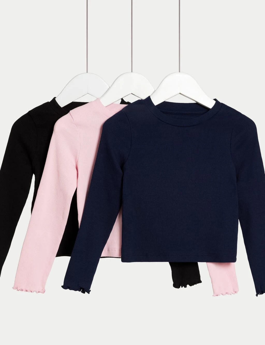 This pack of three cotton-rich tops is a perfect addition to their casual wardrobe. Made to a regular fit from comfy ribbed fabric with added stretch. The long sleeves and round neck make them ideal for layering. Frilled cuffs add a pretty finish.