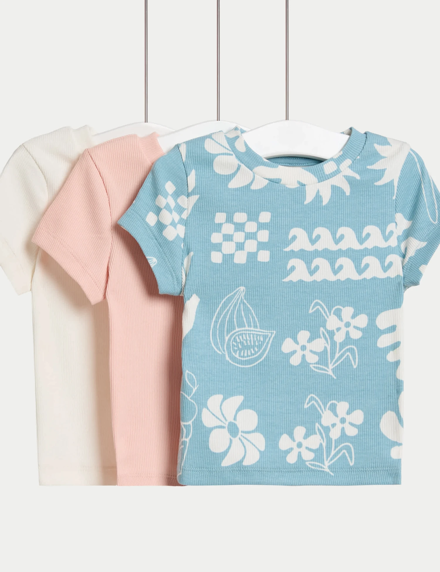 This three-pack of cotton-rich t-shirts is ideal for their summer wardrobe. Regular fit, with a round neckline and added stretch for comfort. One t-shirt features a patterned design, while the other two are plain.