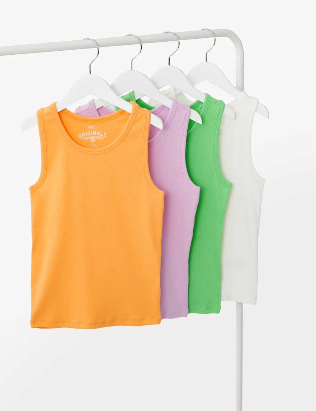 Refresh their wardrobe with these cotton-rich vests. Made to a comfy regular fit from stretchy ribbed fabric. Pack of four includes various bright colours.