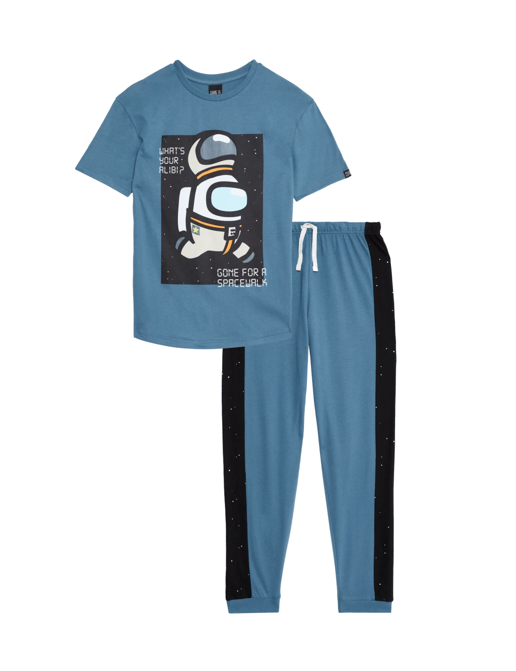 Crafted from pure cotton, these Among Us™ pyjamas feature a cool space theme. Made in a regular fit, the set incudes a short-sleeved t-shirt and full-length, cuffed bottoms with a flexible drawstring waist. An astronaut character on the chest is ‘Gone for a spacewalk’, asking, ‘What’s your alibi?’