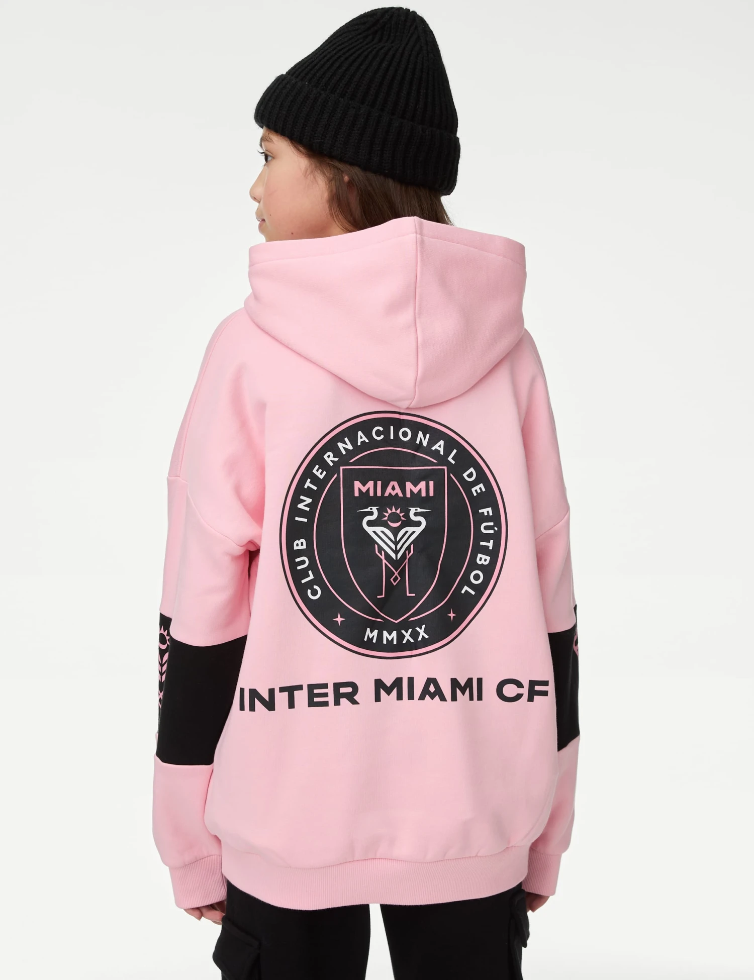 This cotton-rich Inter Miami™ hoodie is a great choice for young football fans. It’s designed in a comfy oversized fit with long sleeves and a kangaroo pocket at the front. The club’s logo is printed on the left chest and the back, while the herons motif appears prominently on each arm. Cuffed wrists help seal in heat.