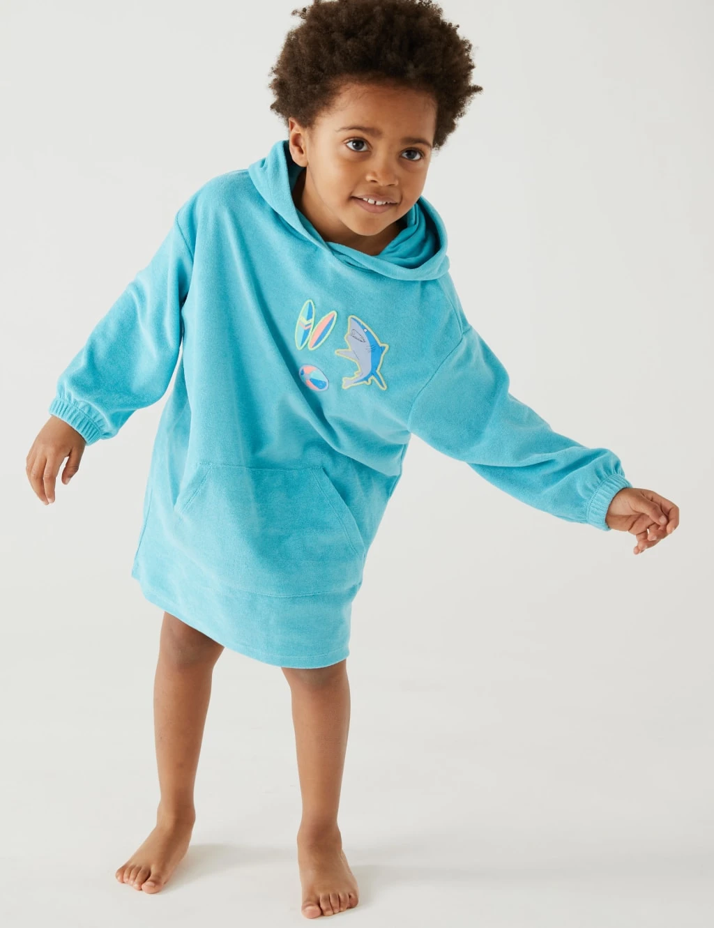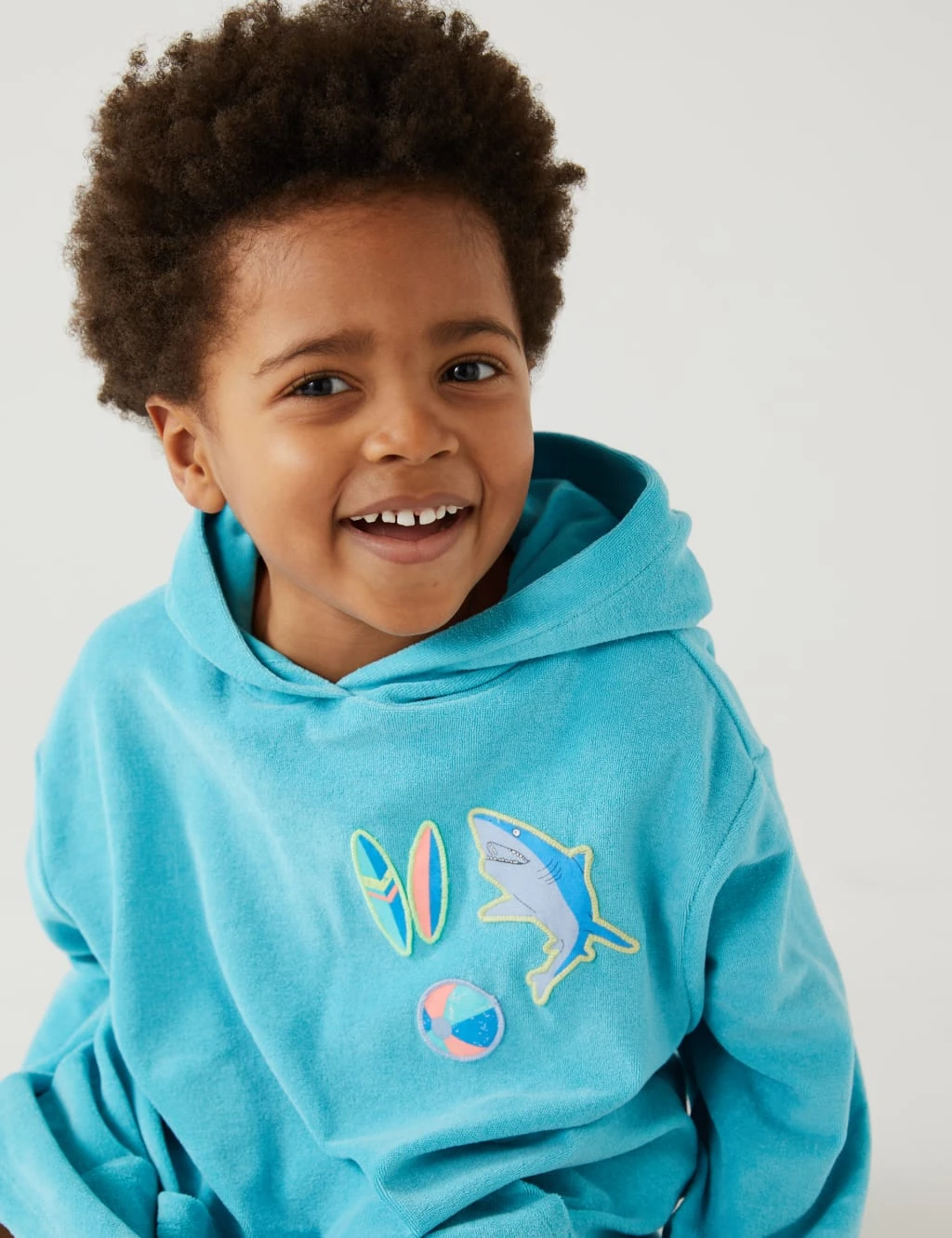 With its absorbent cotton-rich fabric, this towelling poncho will get youngsters dry after swimming. Easy regular fit, with elastic cuffs at the three-quarter sleeves. A kangaroo pocket on the front makes a handy spot to stow stones, shells and other treasures. The embroidered badges on the chest show surfboards, a ball and a shark.