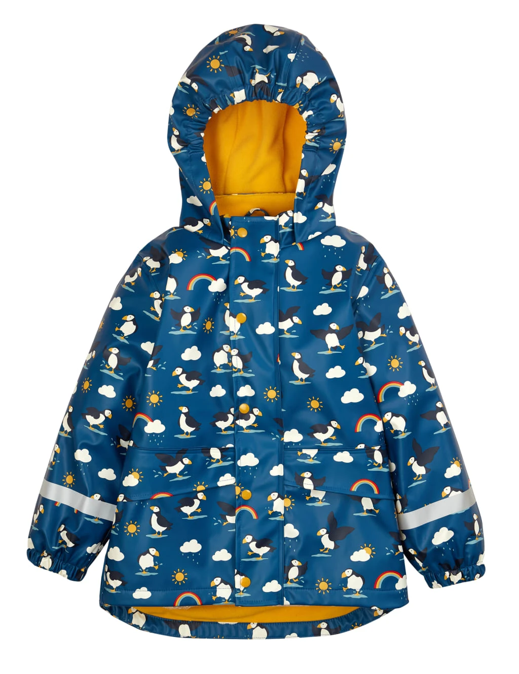 Featuring puddle-jumping puffins, this raincoat from Frugi is a fun way to stay cosy. The waterproof design features a hood and chin guard for extra warmth, plus elasticated cuffs and welded seams to keep them snug. This fleece-lined style has two flap pockets for their on-the-go essentials, while reflective straps help to improve visibility. It fastens with poppers and a covered zip. Made with recycled polyester.