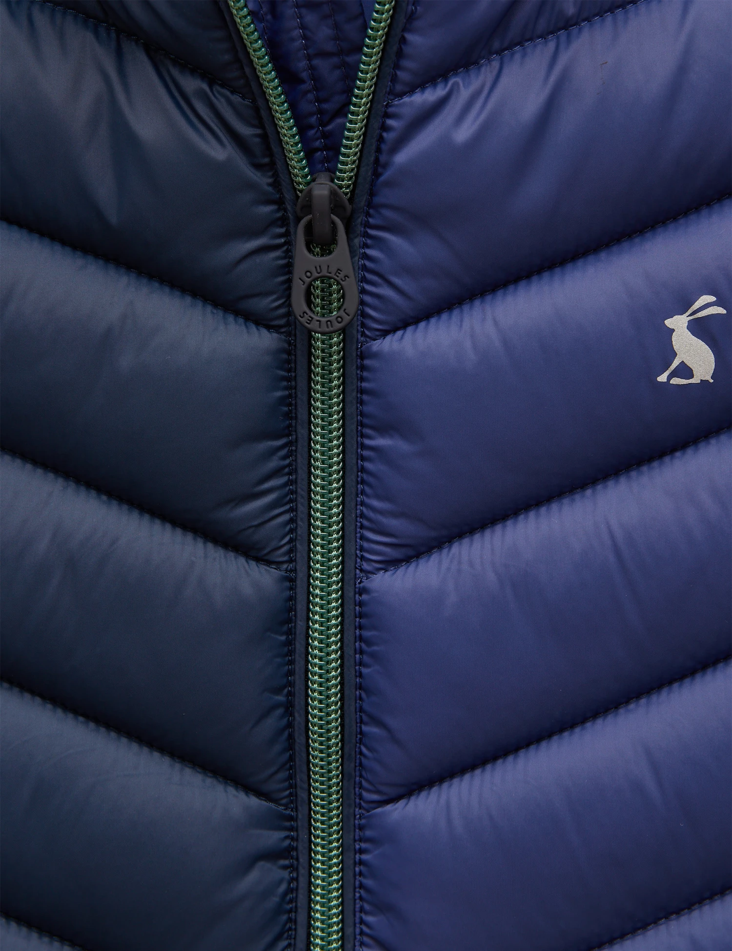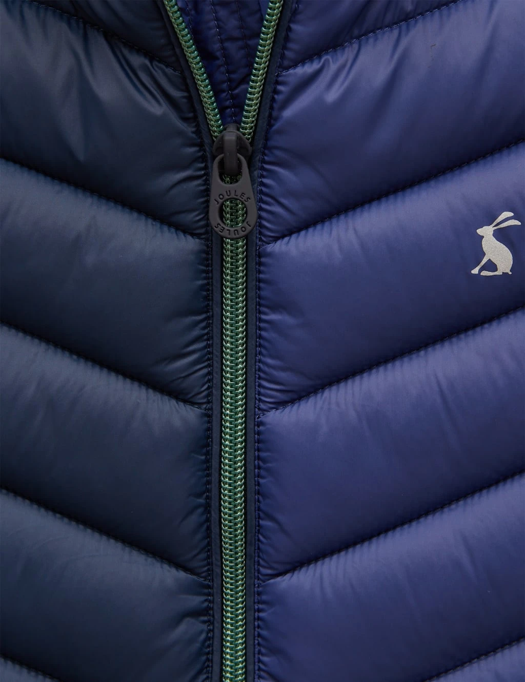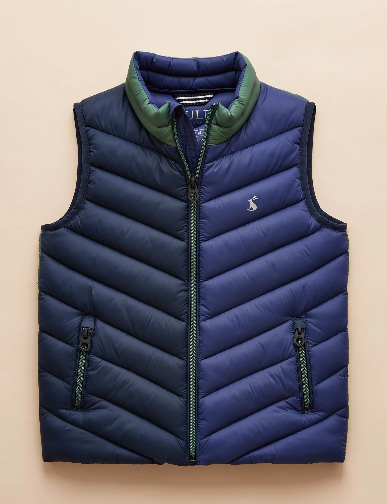 This colour block gilet from Joules is a practical choice for changeable weather. Regular fit, with chevron quilting inside and out along with padding for extra warmth. A showerproof finish helps to keep them dry in wet weather. This piece fastens with a zip that features a chin guard for comfort and is complete with two zipped side pockets. Finished with a printed hare motif on the chest.