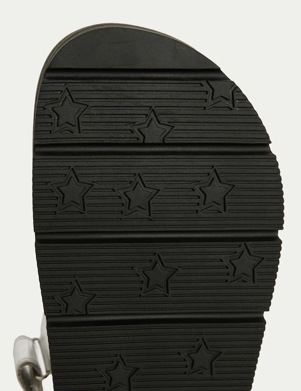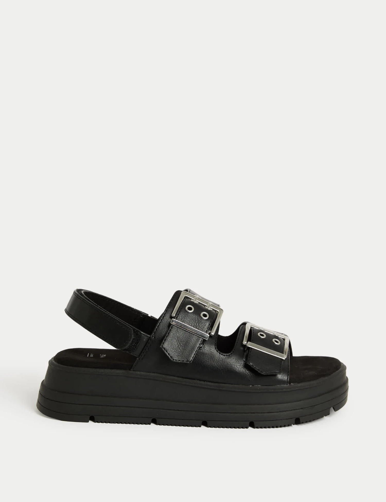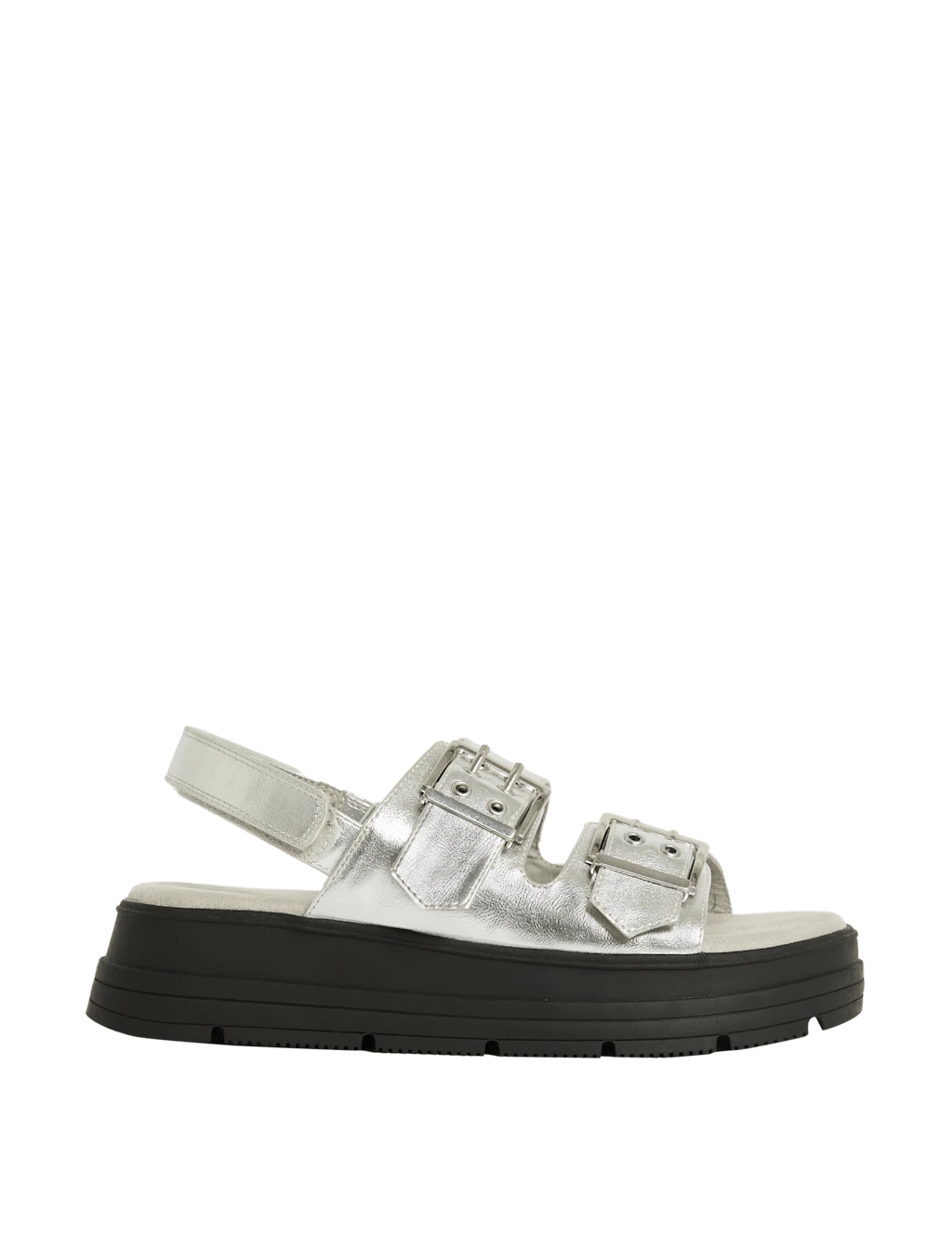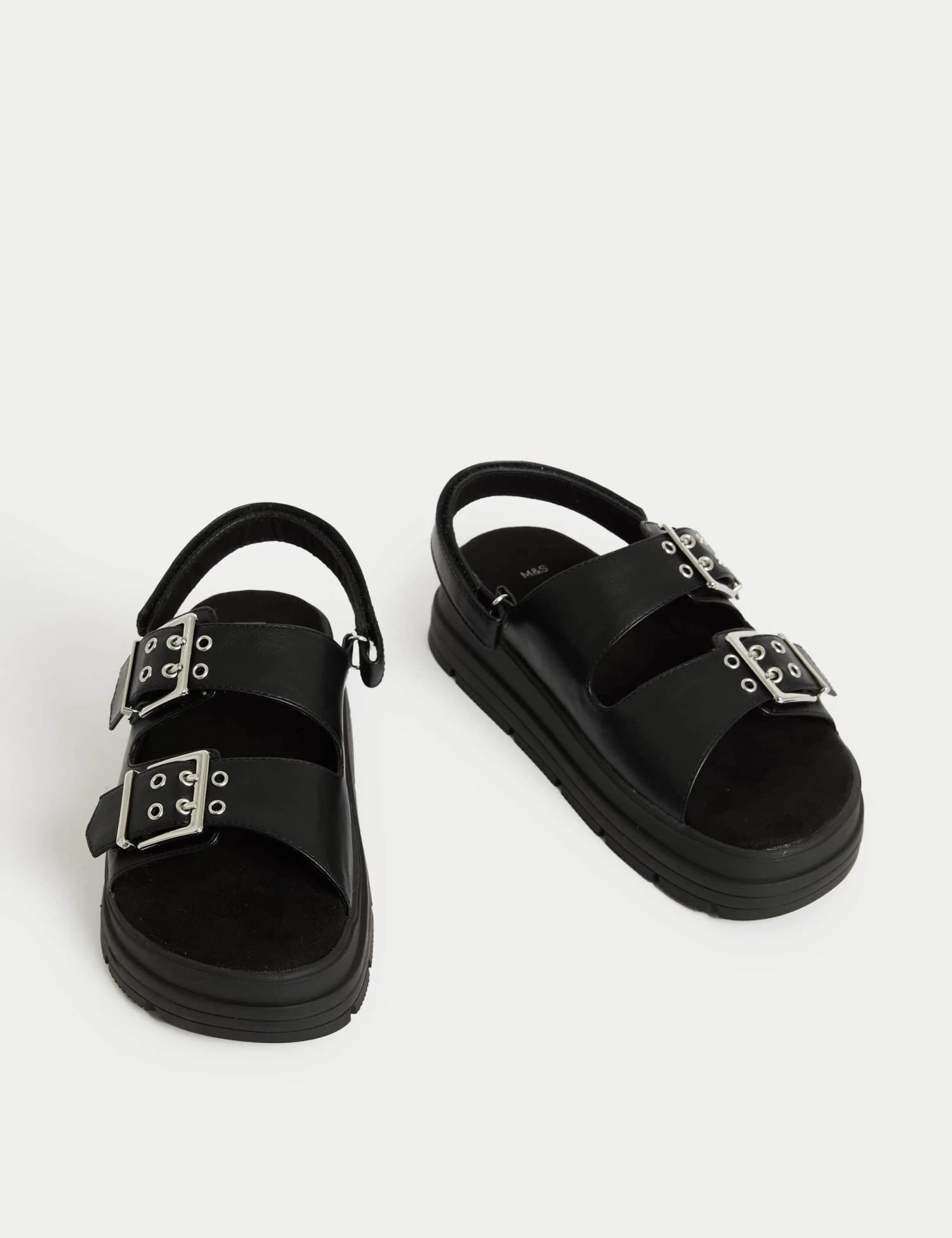 These footbed sandals are a stylish choice for warmer days. Two buckled straps with gleaming hardware across the foot, plus a chunky sole, create a cool aesthetic. A slingback strap features a riptape fastening for quick on and off.