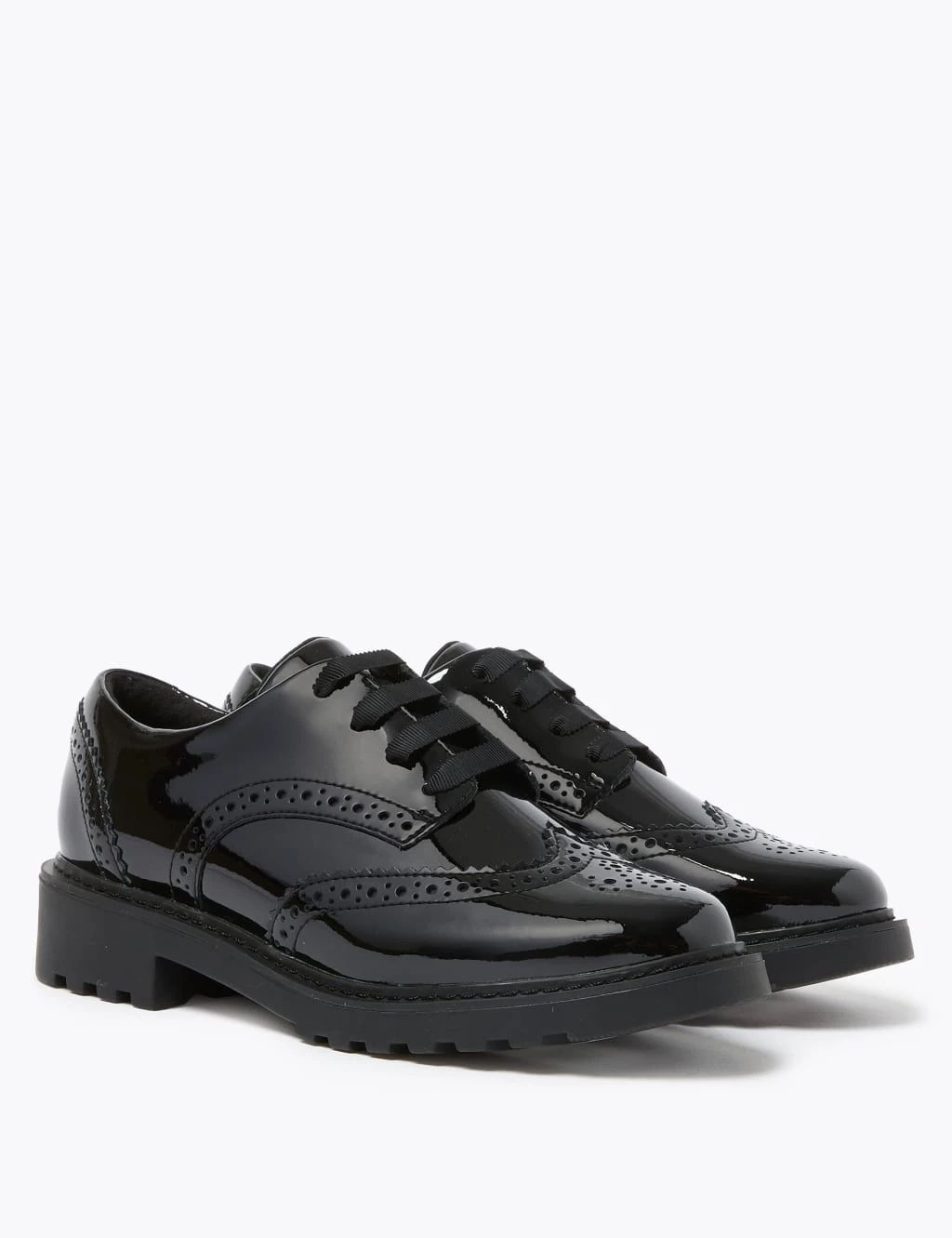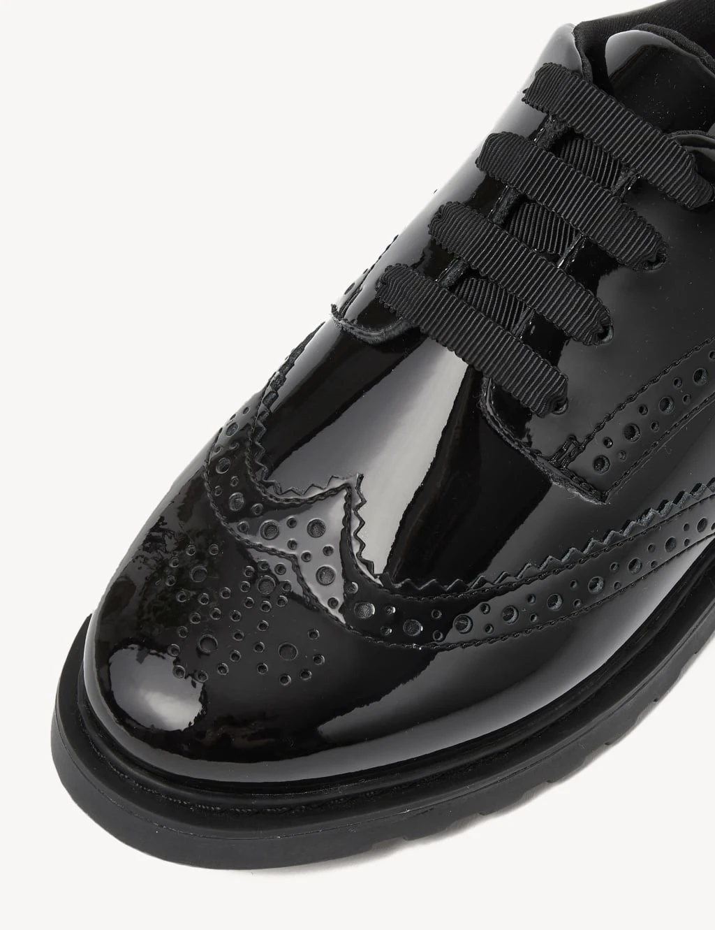 These smart brogues will complement any school uniform. Lace-up design with a sturdy heel and classic detailing, plus a shiny patent finish. Squidgy foam padding for ultimate, all-day comfort. Alongside a breathable lining, our Freshfeet™ technology combats odour-causing bacteria to keep feet fresh. These shoes are made to last, with scuff-resistant leather and non-marking outsoles.