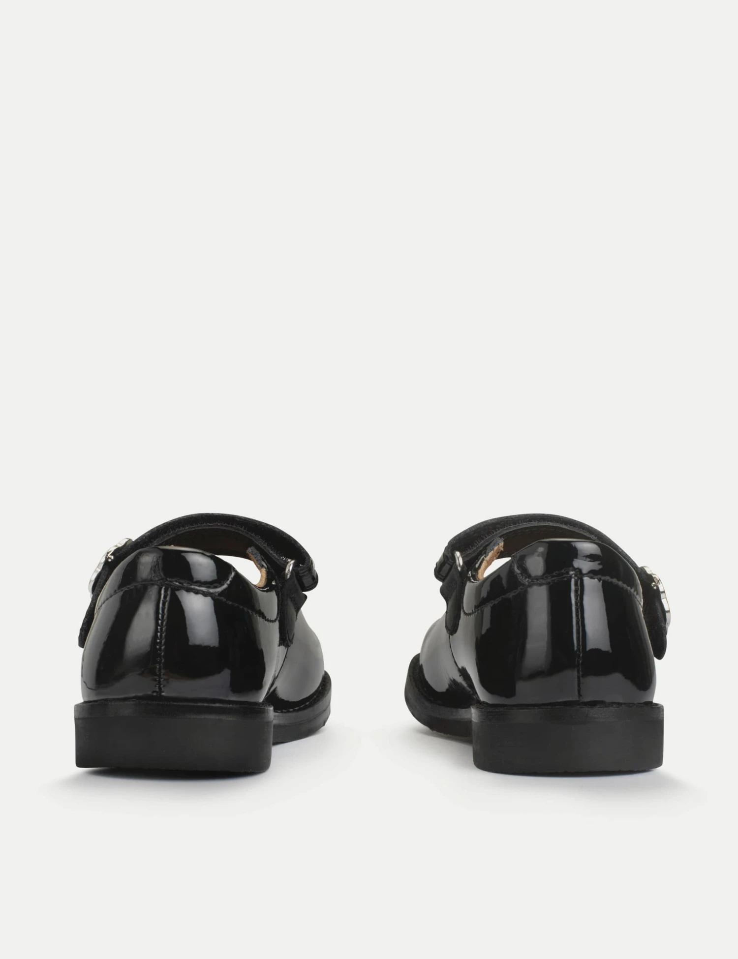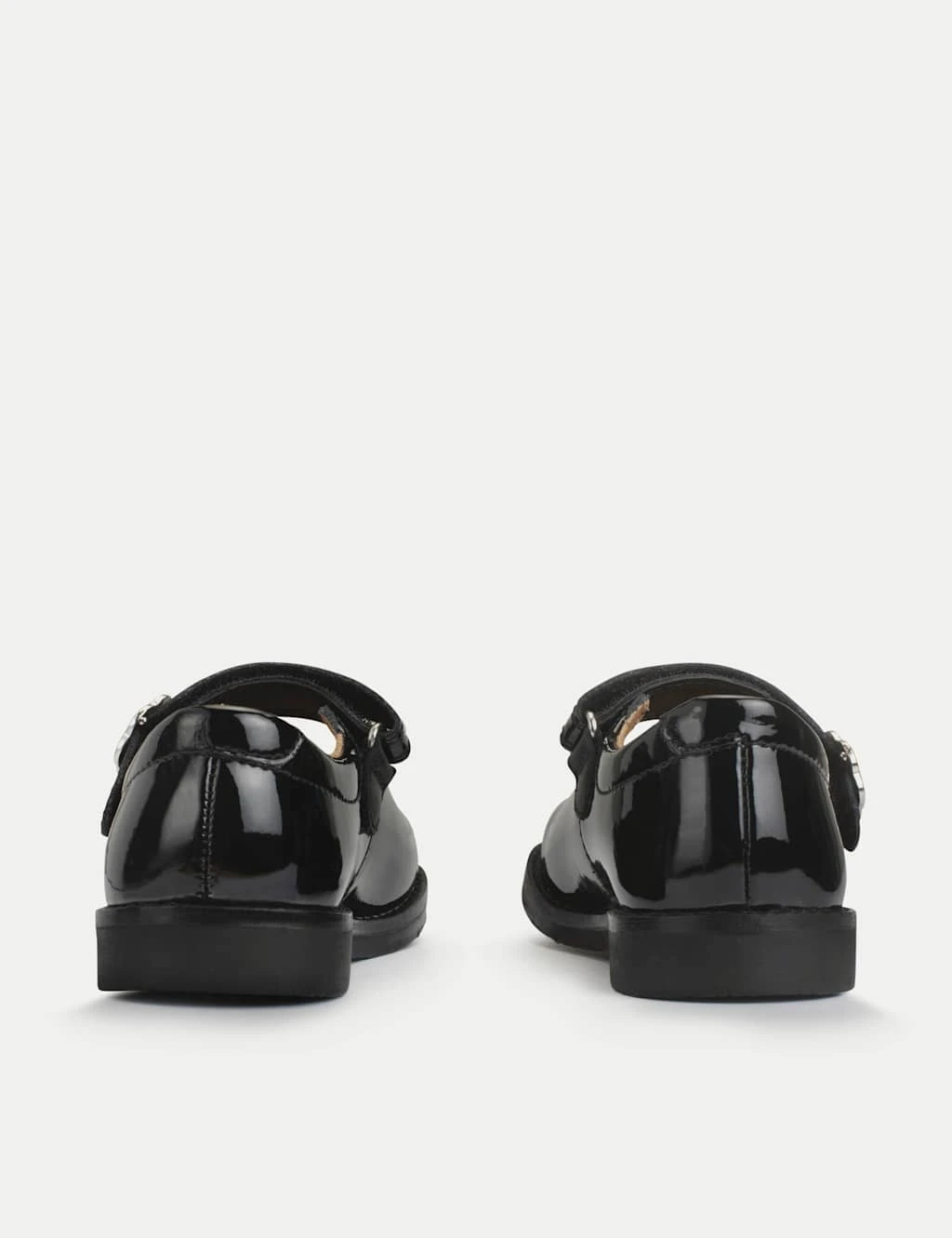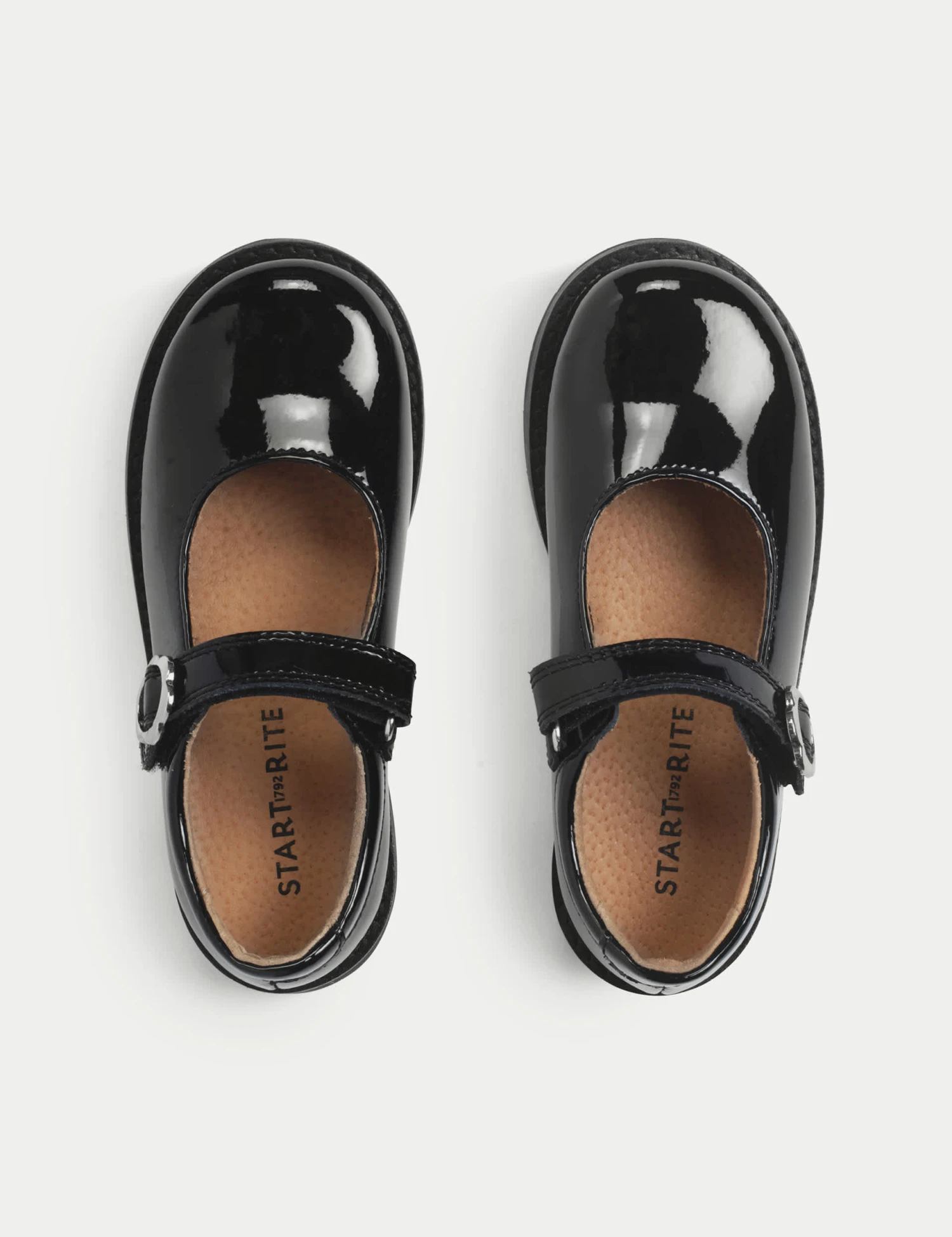 The Debut patent leather Mary Jane shoes by Start-Rite are perfect for school. They have a riptape fastening with a faux flower buckle for quick on and off. Rubber soles provide good grip and a padded collar offers a cushioned feel.