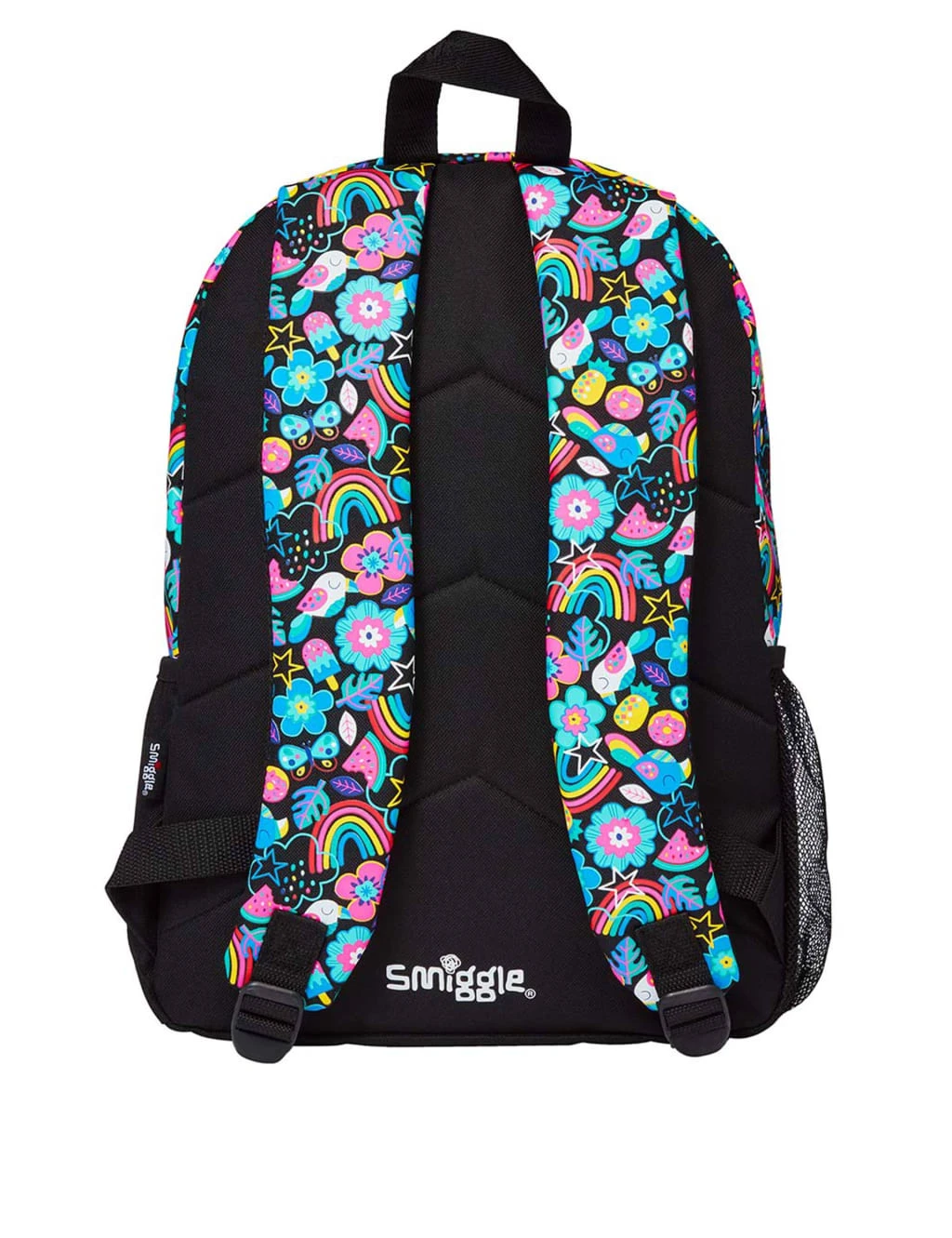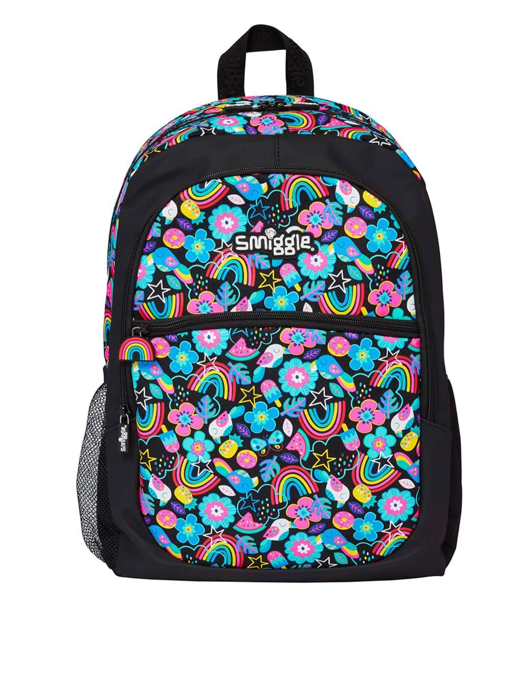 This bright rainbow and bird print Smiggle backpack is sure to become a favourite. The padded straps are adjustable for a comfy fit. The large main compartment fastens with a double zip and features a handy name label inside along with a dedicated inner sleeve for their laptop or tablet. Plus, the zipped front compartment is perfect for smaller items and they can store their water bottle in the mesh side pocket.