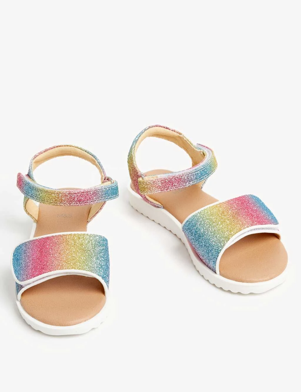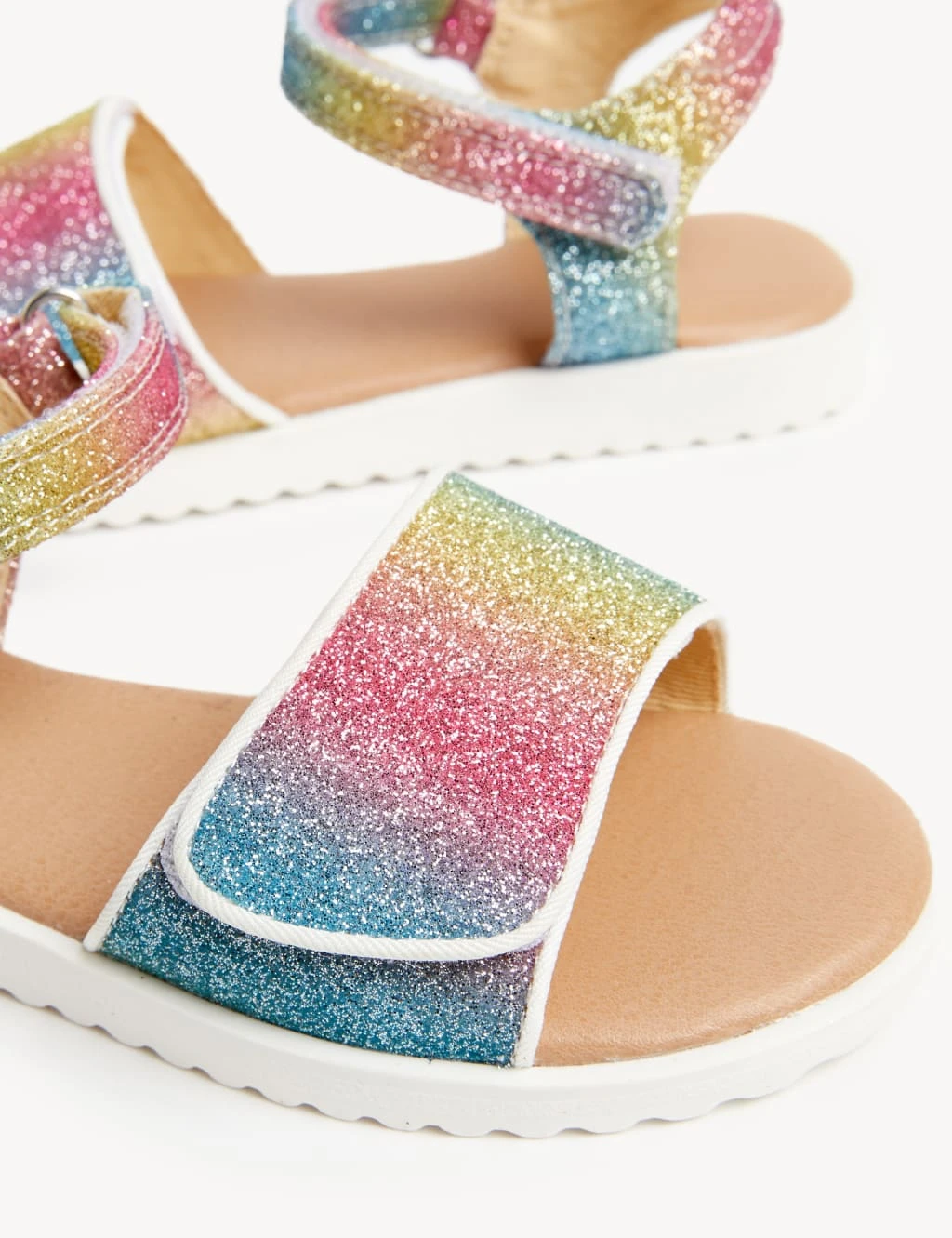 Let little ones shine bright with these rainbow glitter sandals. Standard fit, designed with a flat footbed for comfort. Riptape fastenings make sure they’re easy to get on and off.