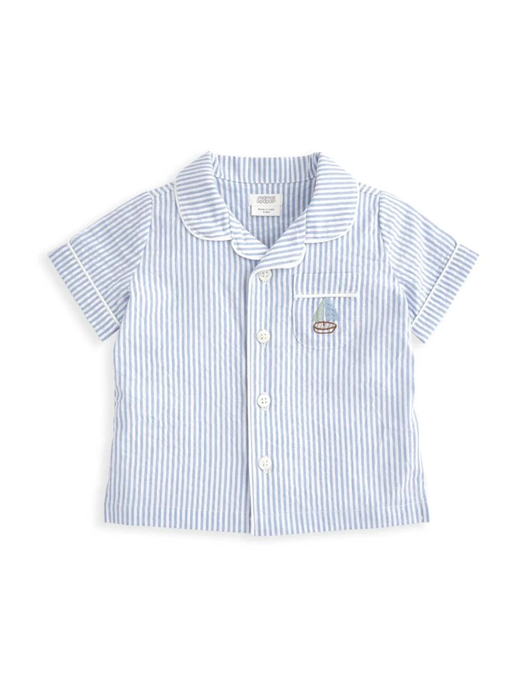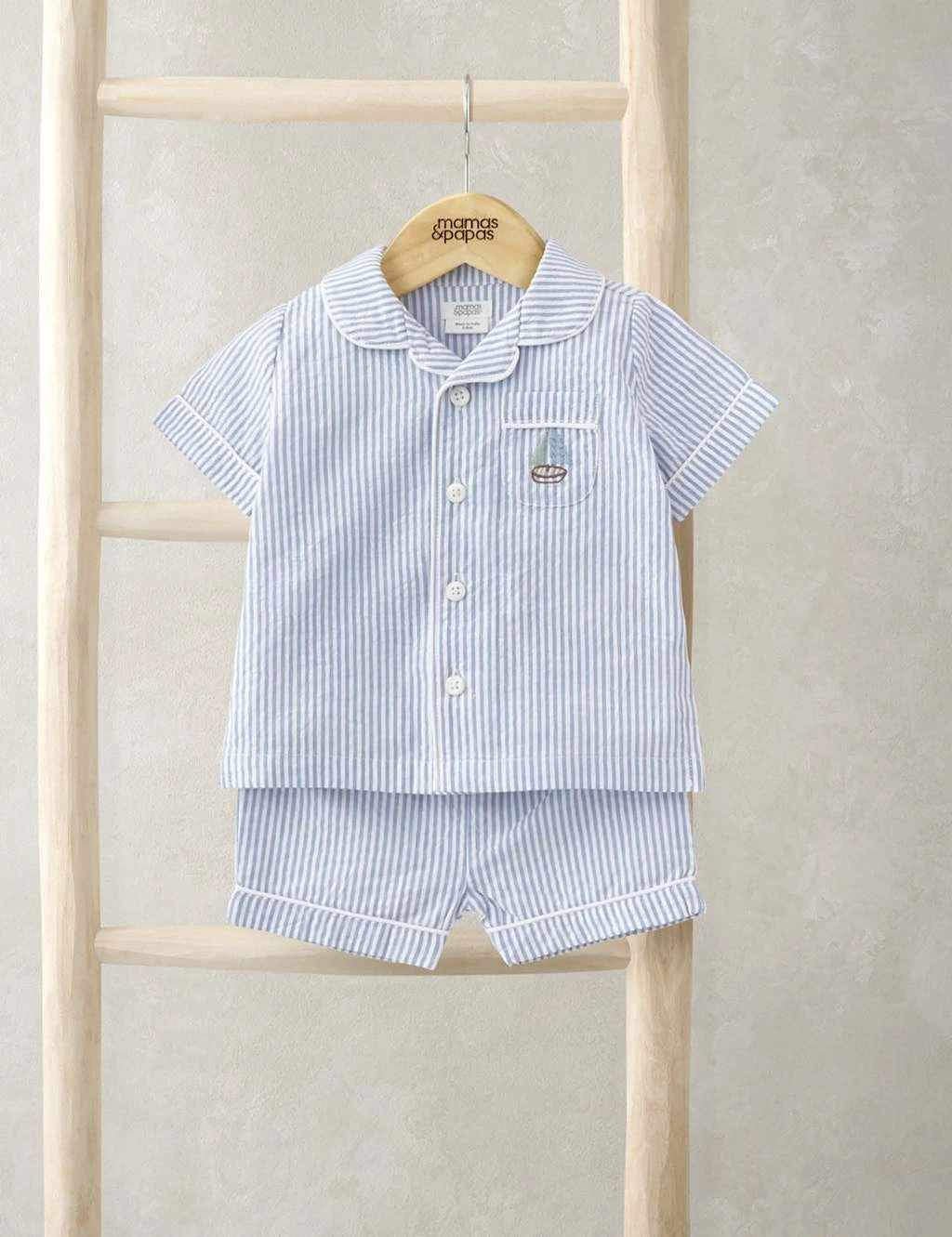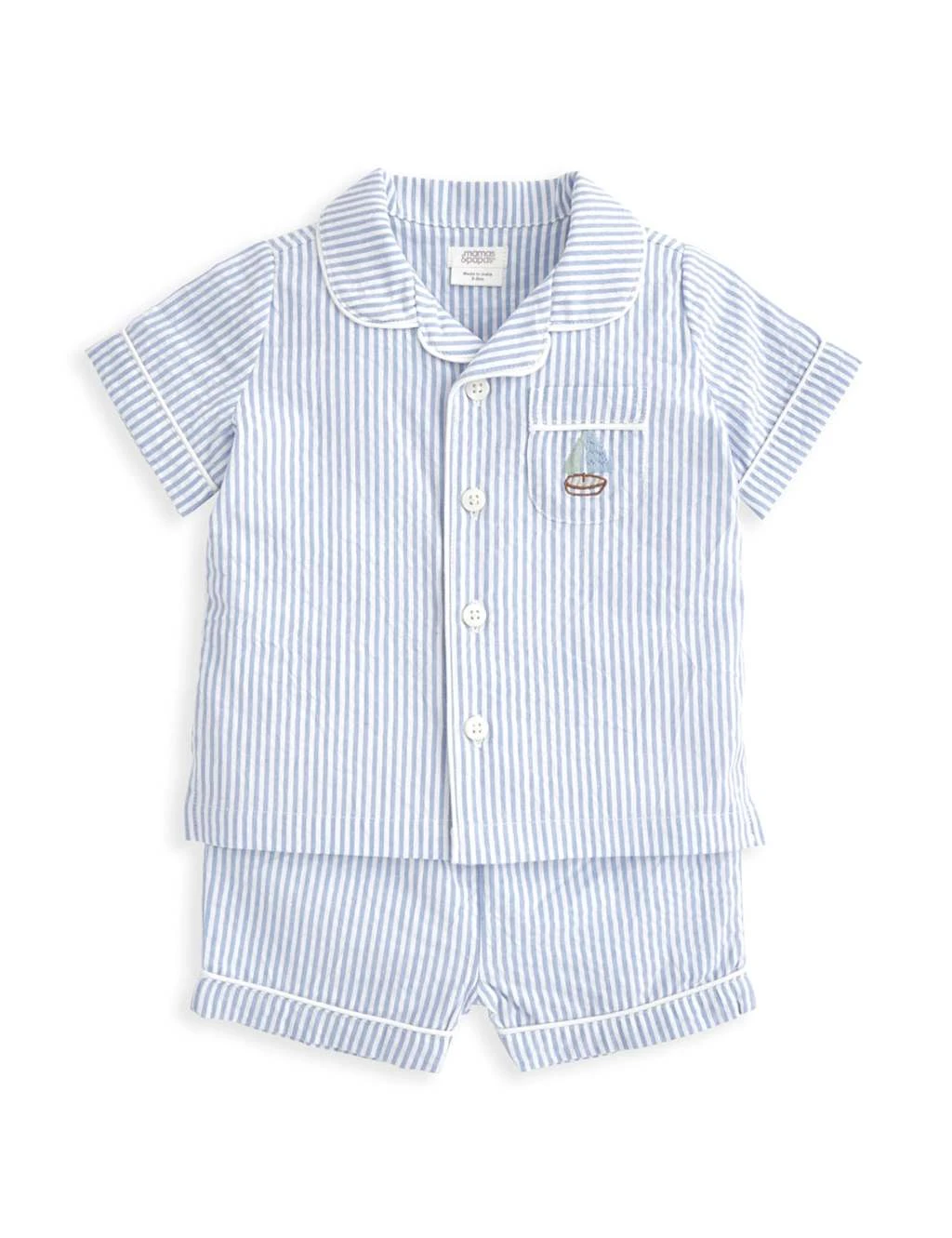 These pure cotton striped pyjamas from Mamas & Papas are as cute as they are comfy. The short-sleeved shirt features a button-through fastening and a patch pocket on the chest embroidered with a boat. A matching pair of shorts completes the set.