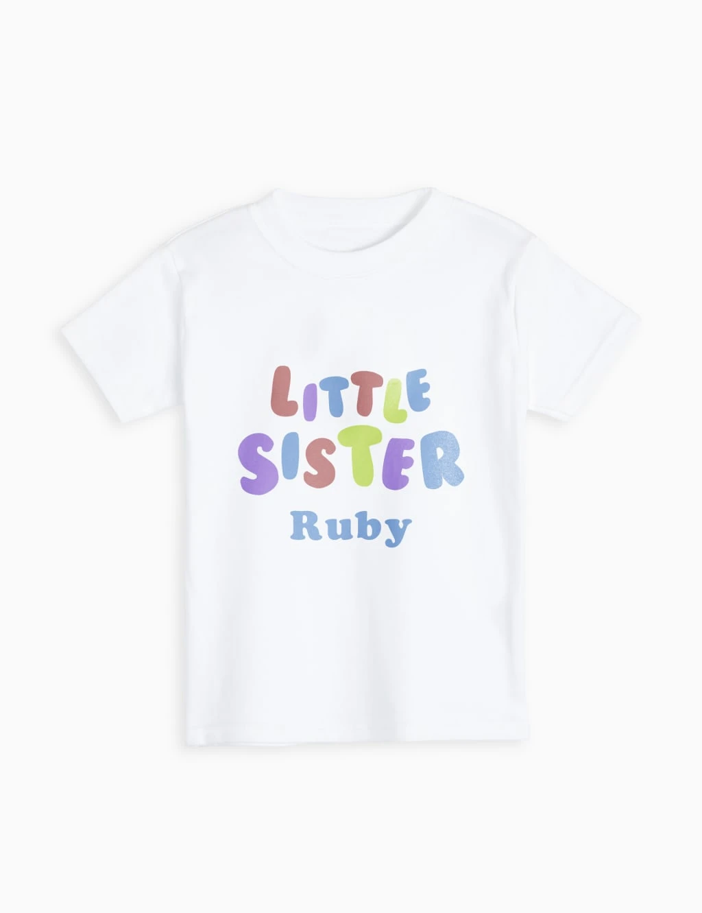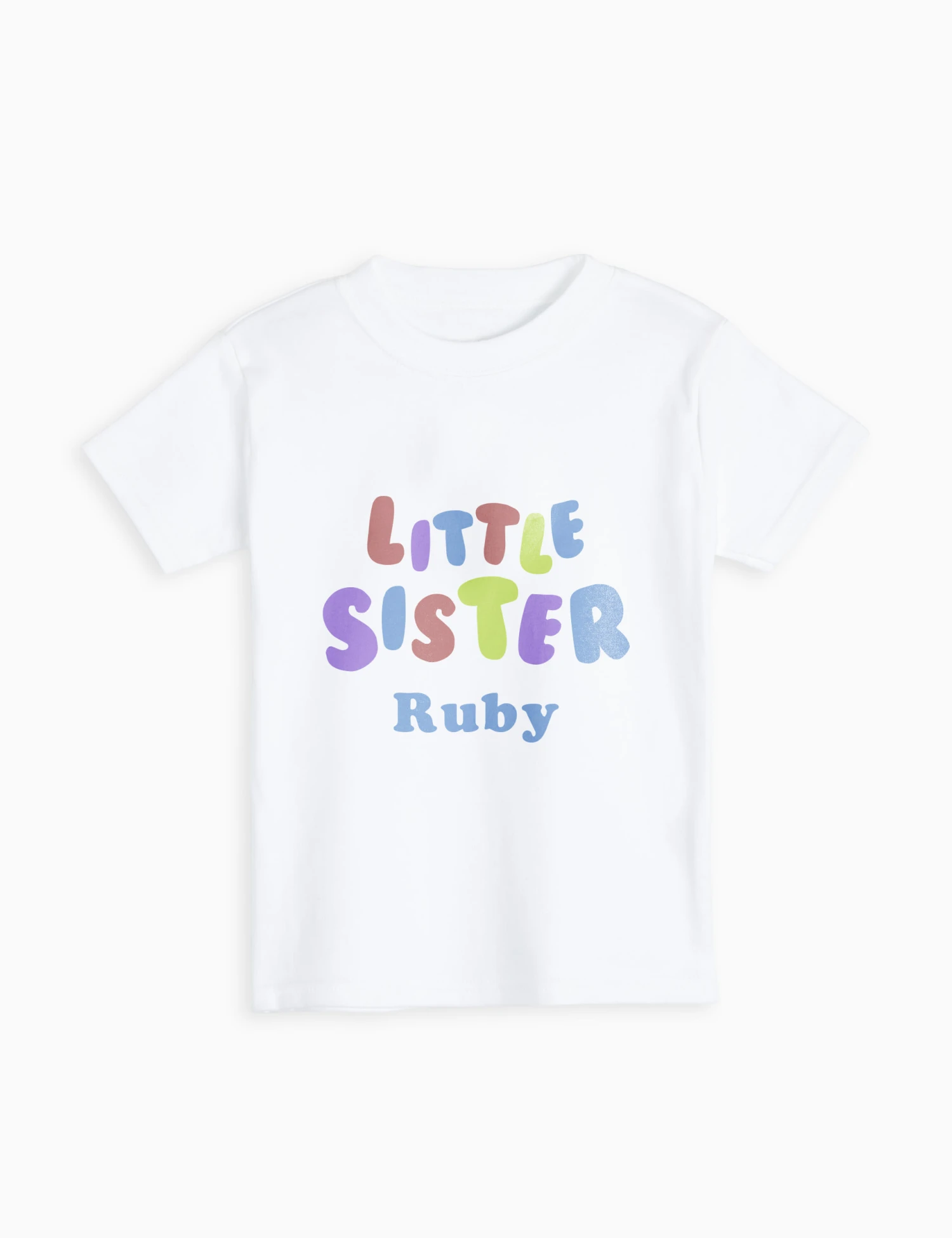For the newly promoted sibling, this is a great way to show off your new title! Get the matching Big sibiling t-shirt which is available separately. Personalisable. The words Little Sister are included in the design, only the name is required for personalising.