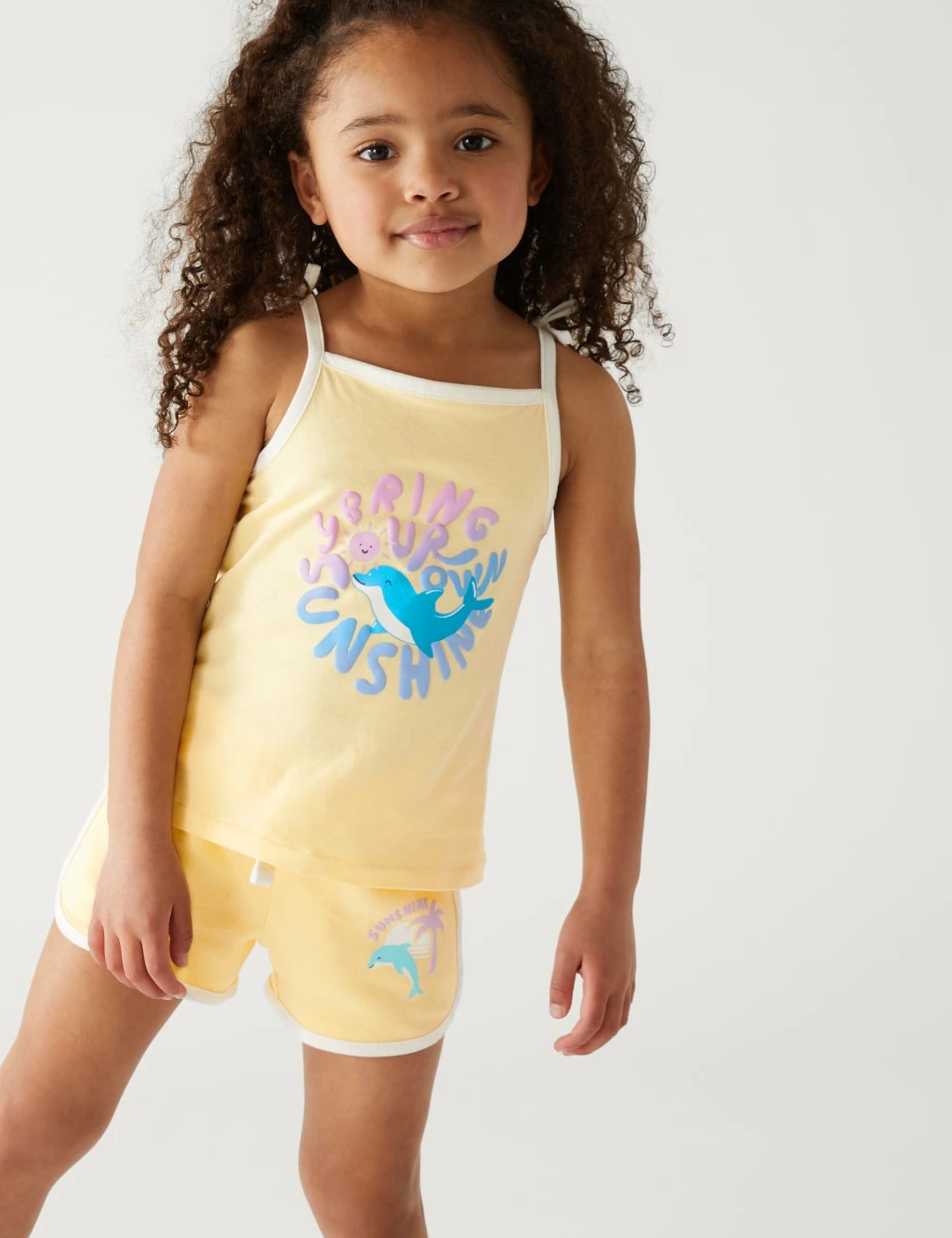 Bring a touch of the sea to your little one’s wardrobe with this pure cotton top. It’s cut to a regular fit for comfort. Features a square neck and pretty bow detailing on the straps. Complete with a cute ‘Bring Your Own Sunshine’ graphic around a smiling dolphin.