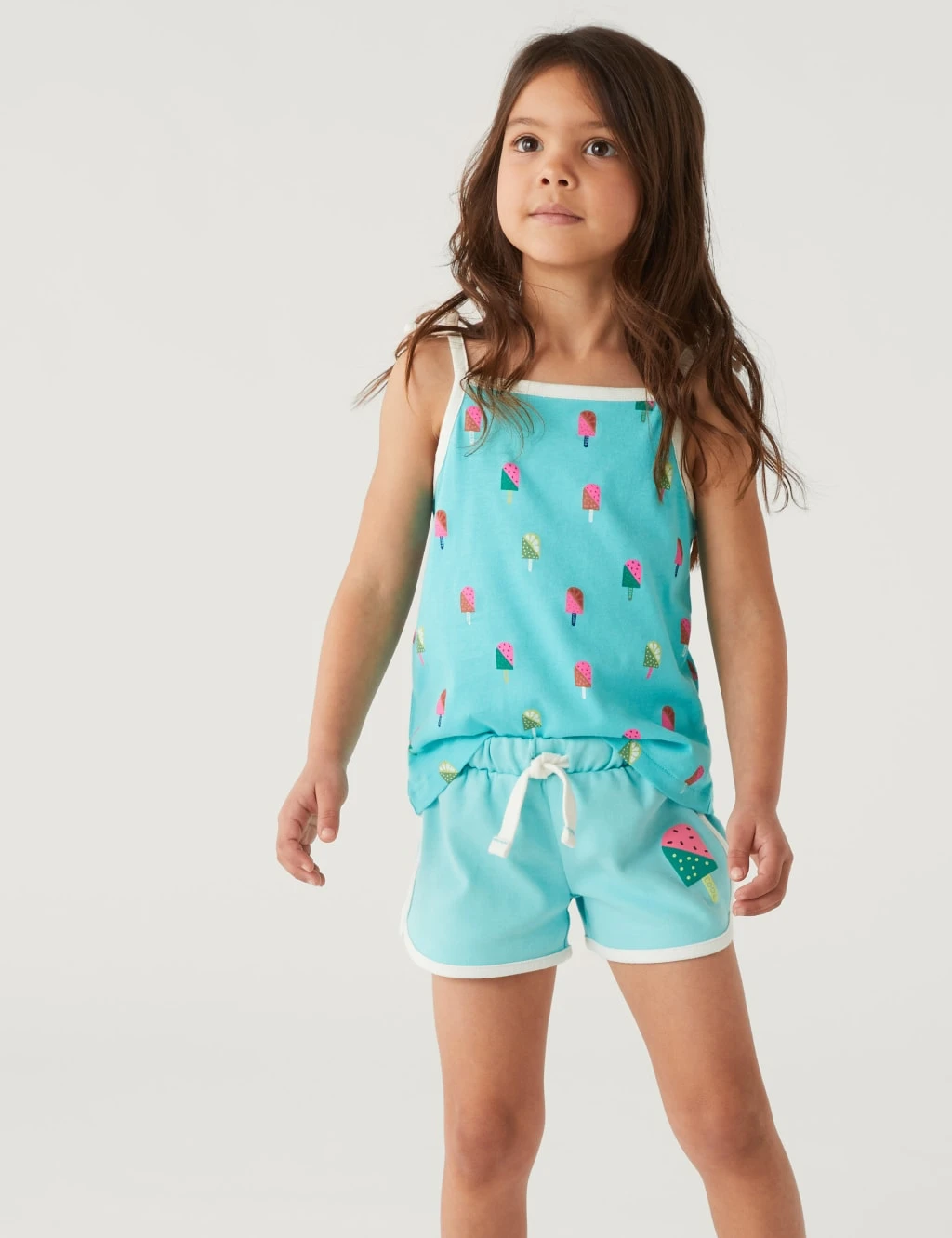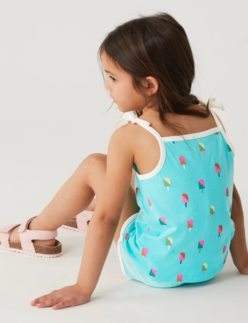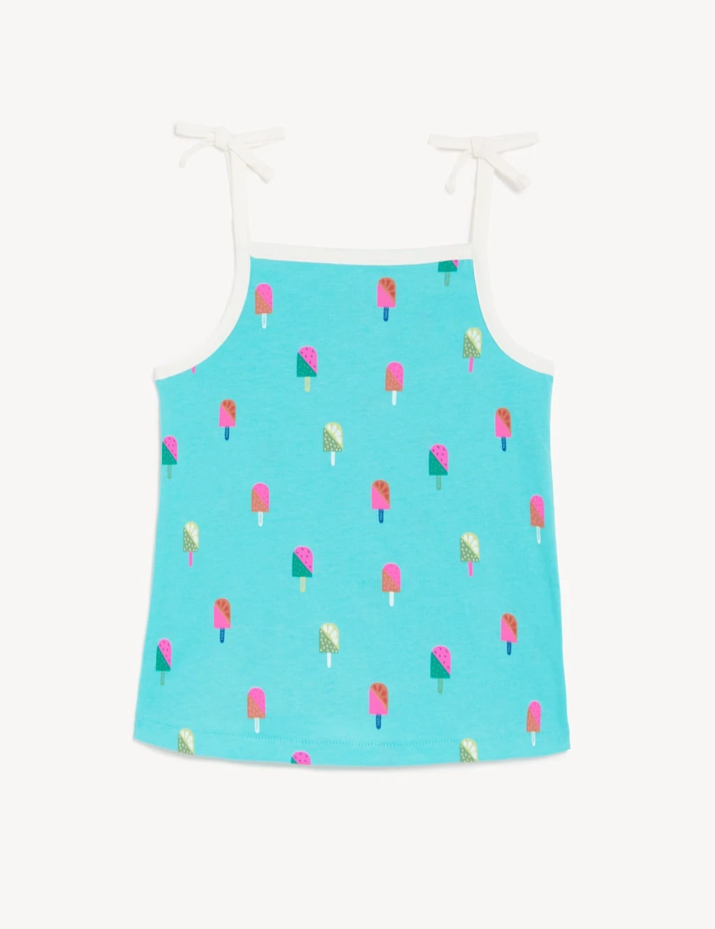 This pure cotton cami top is a fun choice for warm weather. Regular fit. Decorated with a sprinkling of ice cream illustrations that have an instantly summery feel. Complete with pretty bow detailing on the straps.