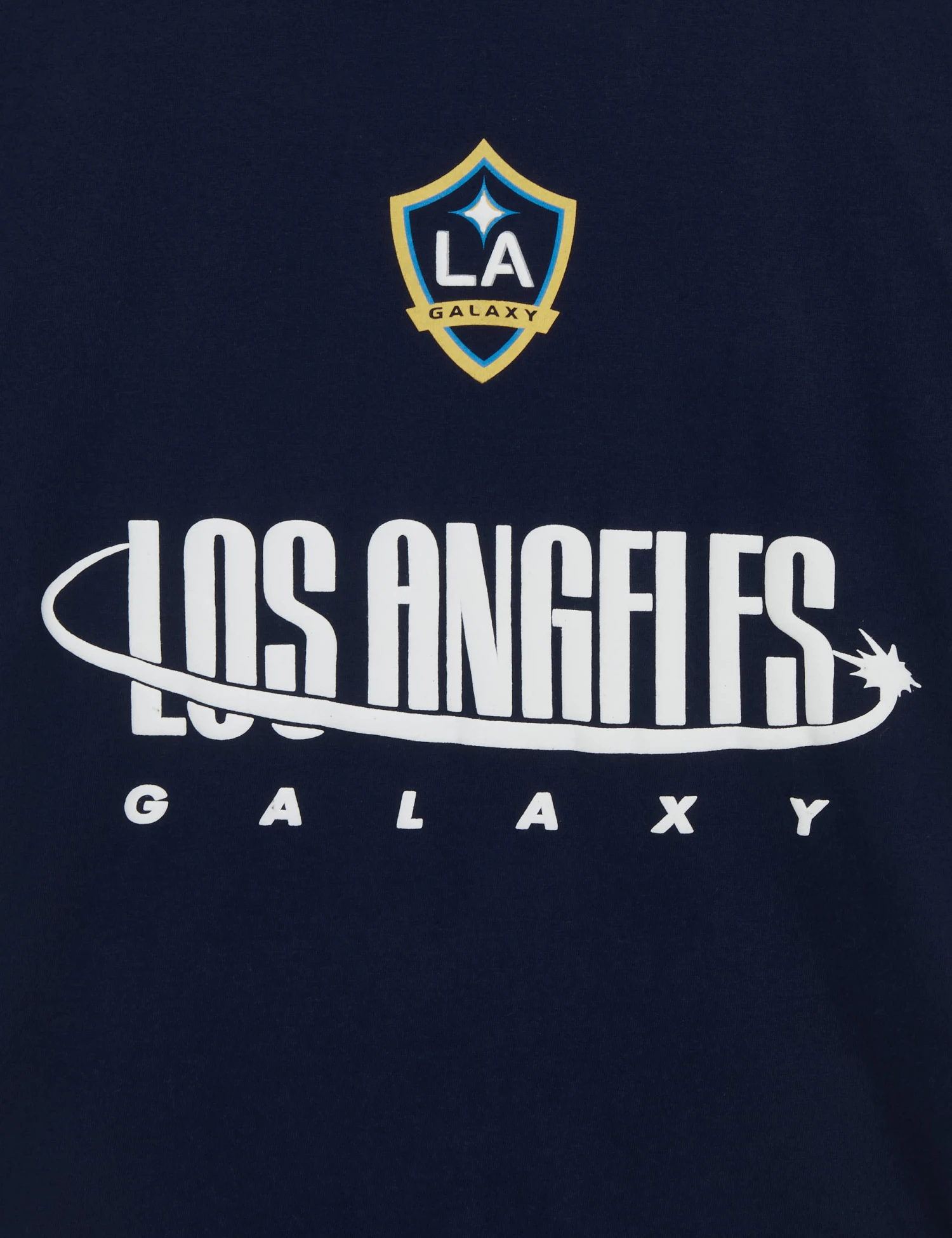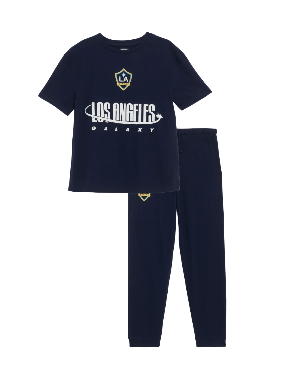 With their cool LA Galaxy™ theme, these pyjamas are perfect for young fans. Comfy regular fit, with short sleeves and long legs that are ideal for in-between nights. The top has a placement graphic of the team’s logo, while the bottoms have a small badge on one thigh.