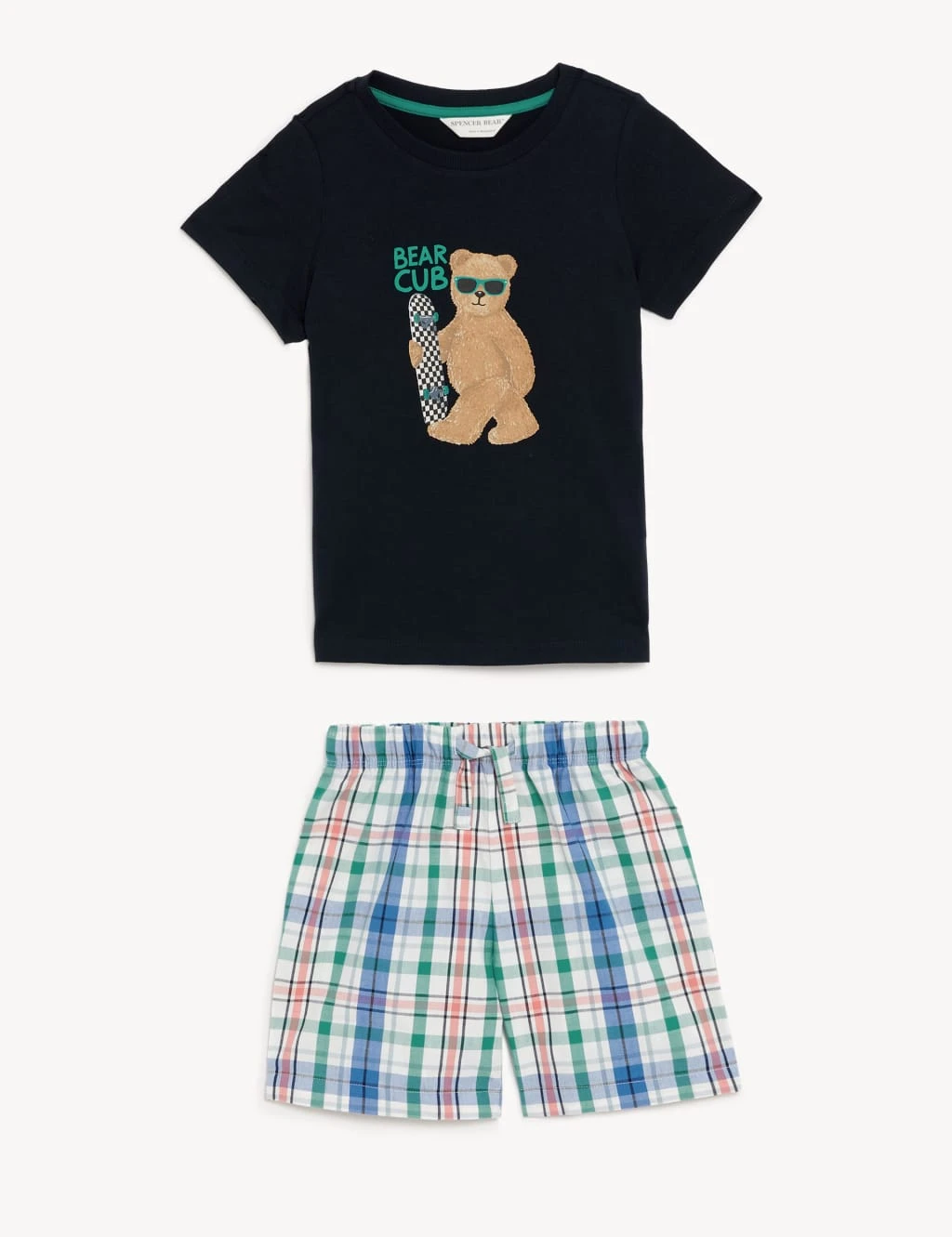 These pure cotton pyjamas will make a cute addition to their sleepwear collection. Made in a regular fit for comfort. Includes a pair of checked shorts with an elasticated waist and a drawstring fastening, as well as a short-sleeved t-shirt with a round neck. Complete with a cool graphic of our mascot Spencer Bear for added personality.