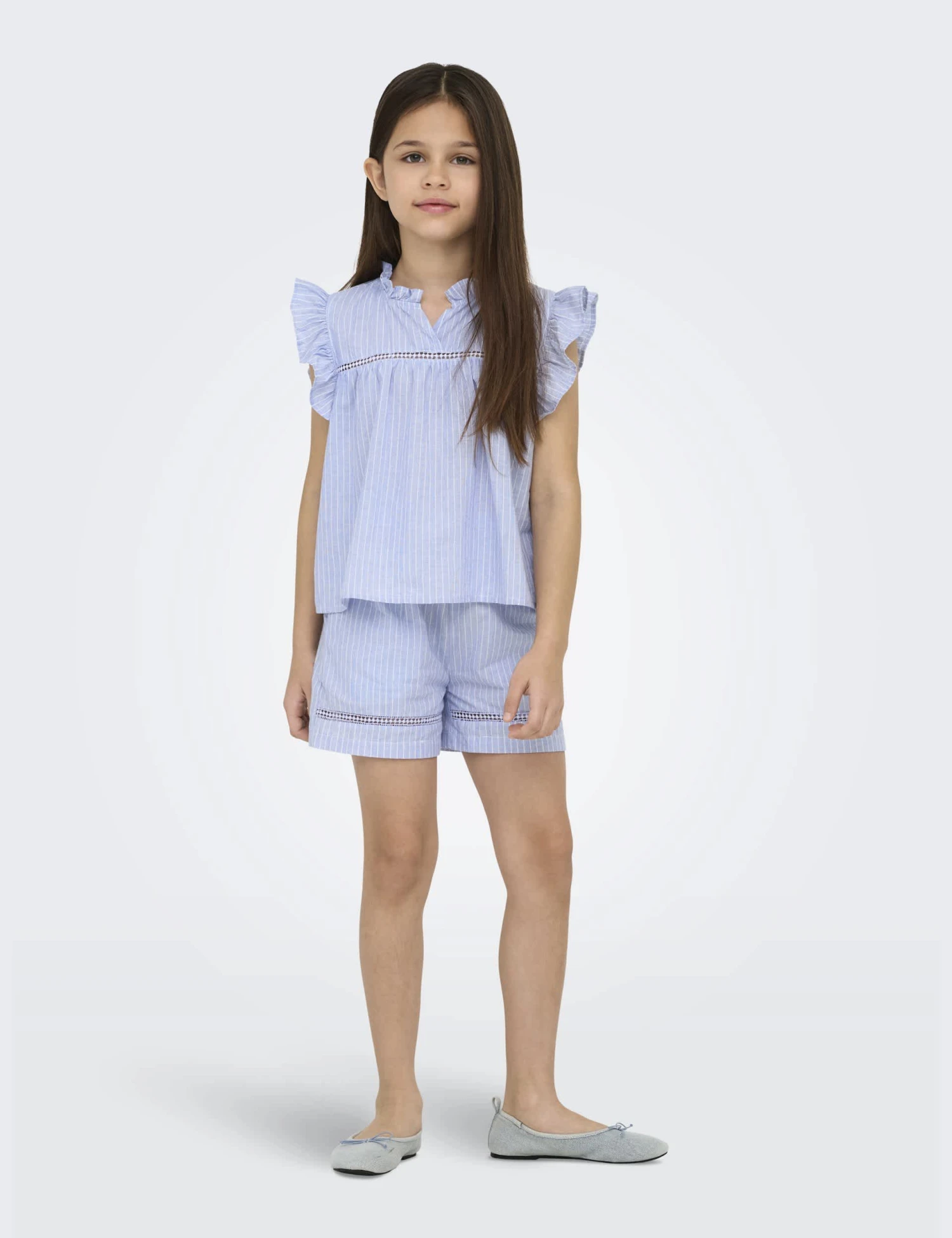 This cotton blouse from Kids Only features a crisp striped print that’s ideal for the warmer months. It’s designed in a regular fit, with a v-neckline and cap sleeves. Ruffled trims add a pretty finish, while ladder trims complete the versatile piece.